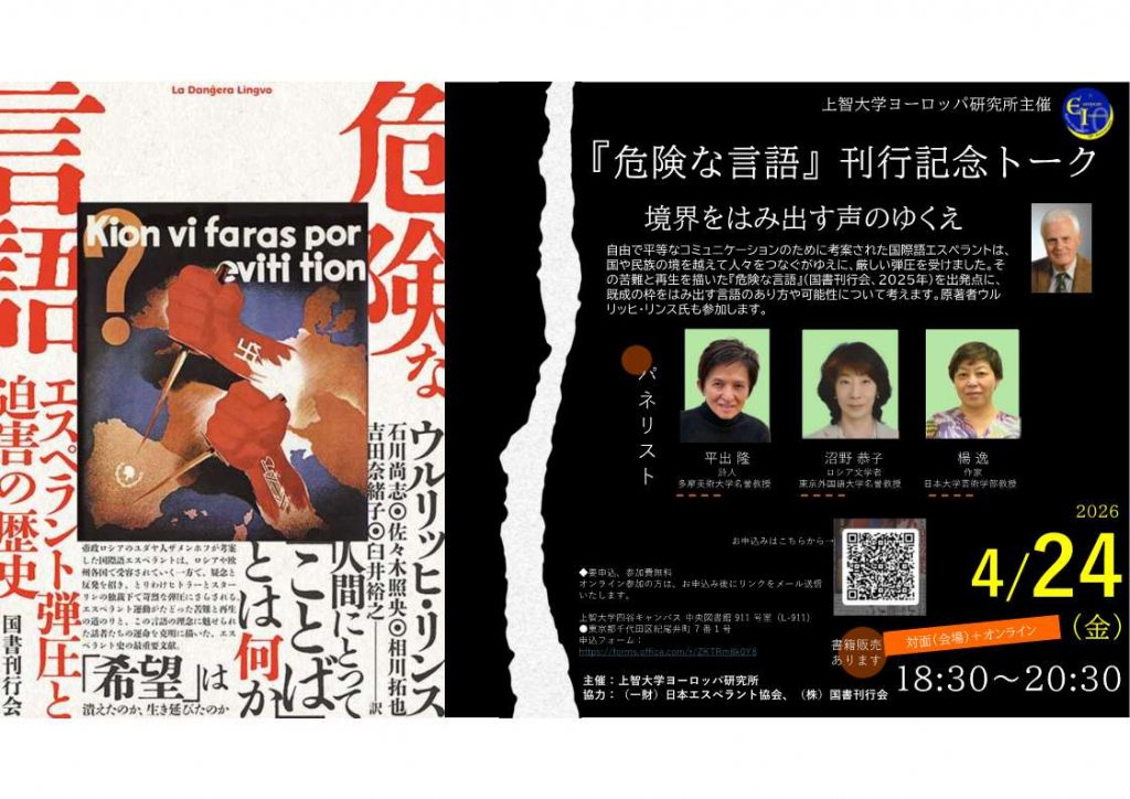 TUFS出身者3名を含むエスペランティスト5人による共訳書『危険な言語――エスペラント弾圧と迫害の歴史』(ウルリッヒ・リンス 著)を昨秋に上梓しました(詳細は https://posts.gaigokai.or.jp/?p=4577)。